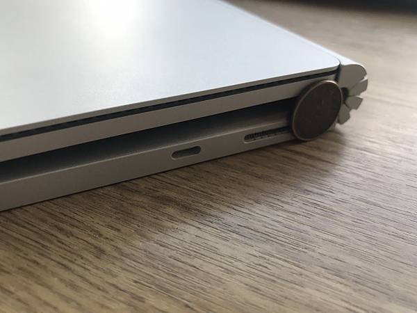 - 螢幕與鍵盤座連接處的轉軸厚度用1元硬幣比較,設計的方式如同型號名稱一樣