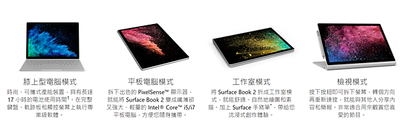 Book 2 如同第一代一樣,螢幕是可以與鍵盤座分離成一個平板的,依照微軟官網的圖示表示總共可以有4種工作模式