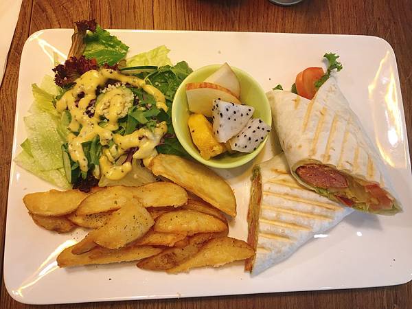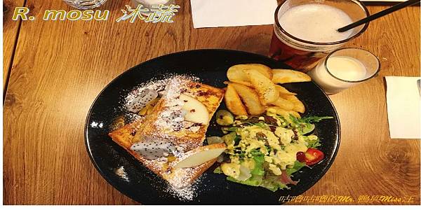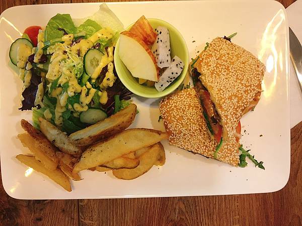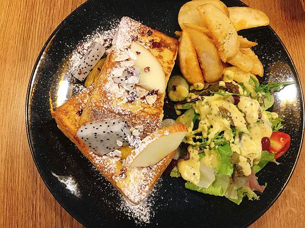 這邊搭配了沙拉、薯塊 以及 一些水果,上面灑的糖粉也不會讓吐司太甜,整體調味搭配非常爽口